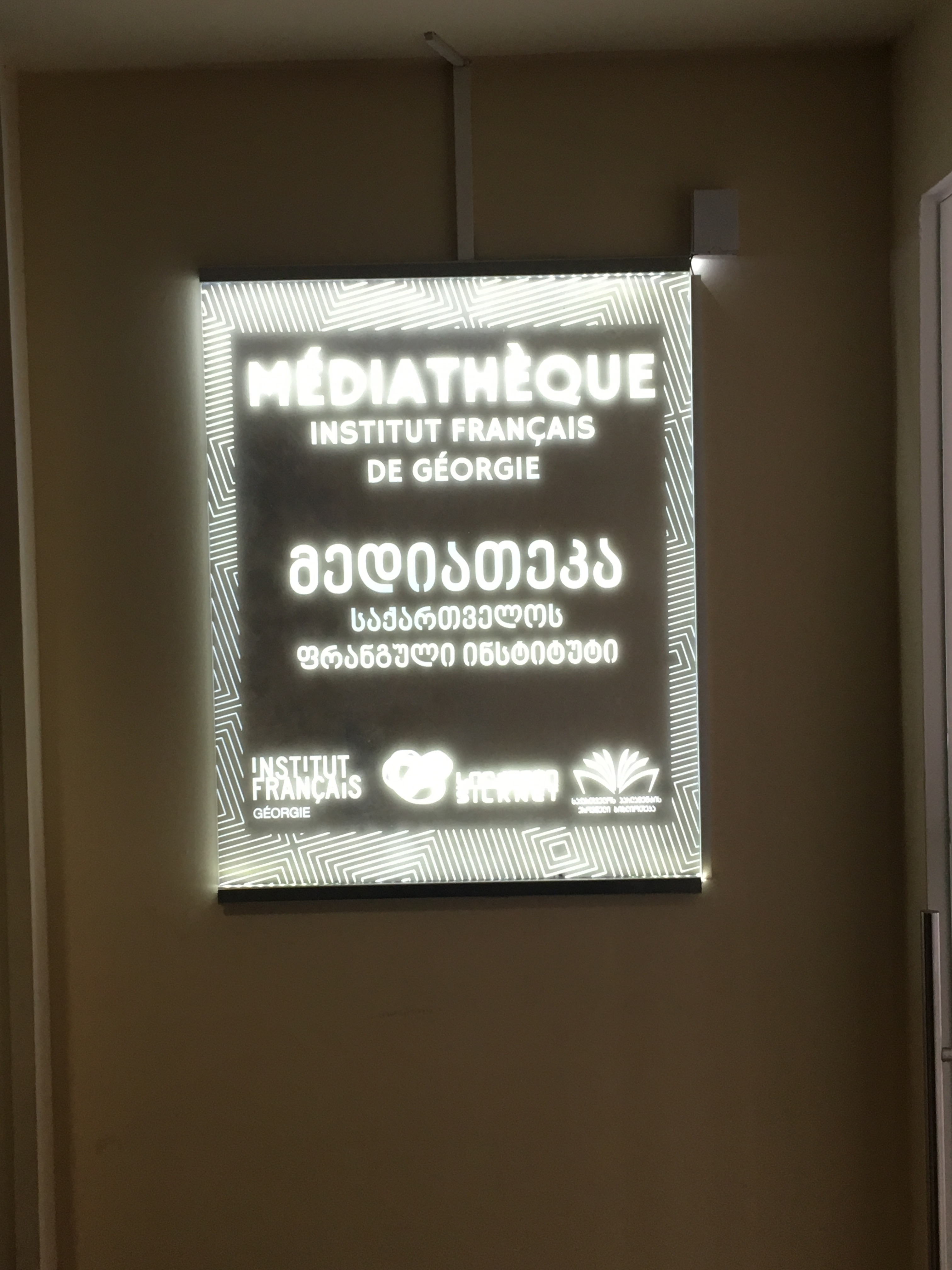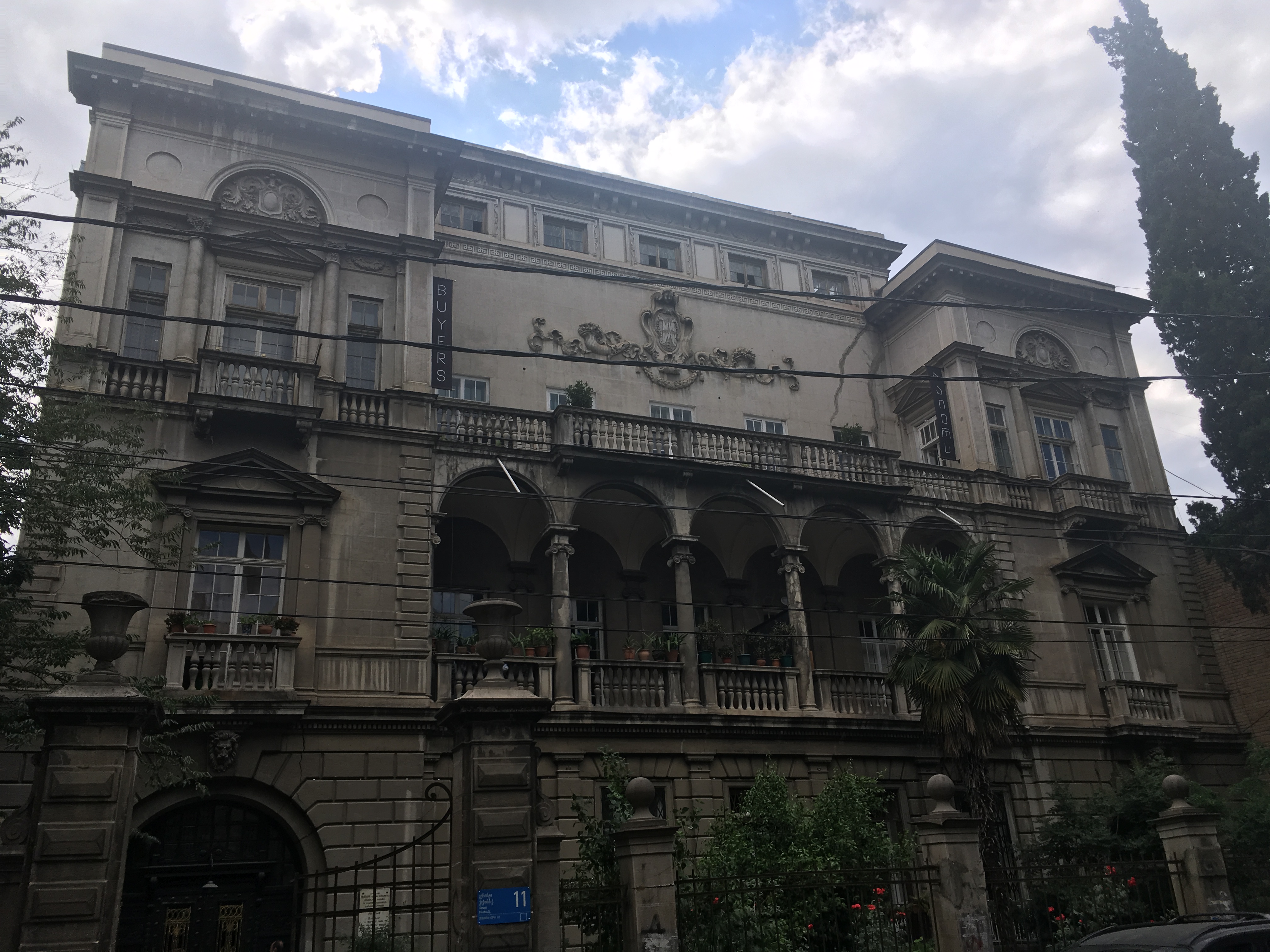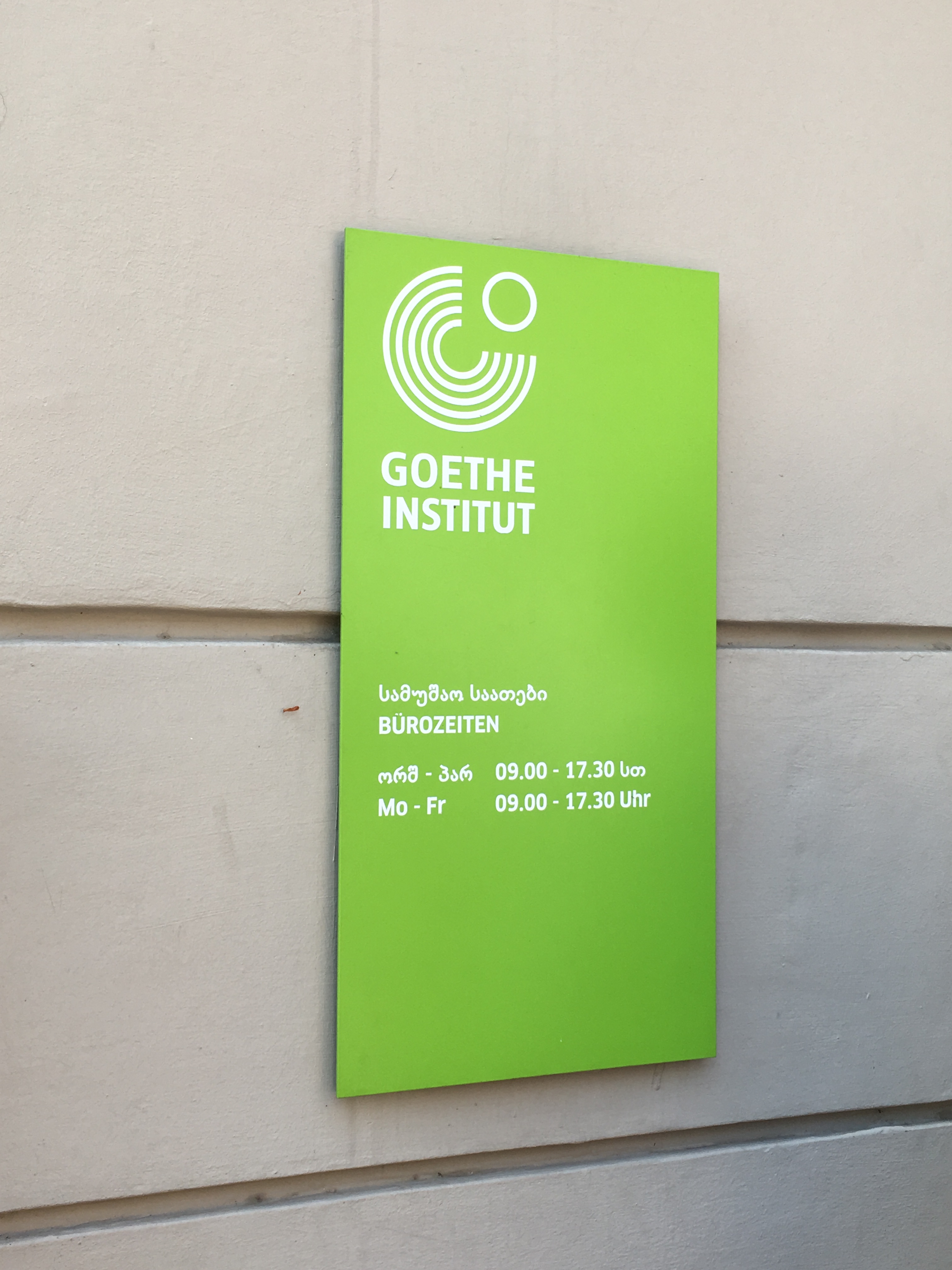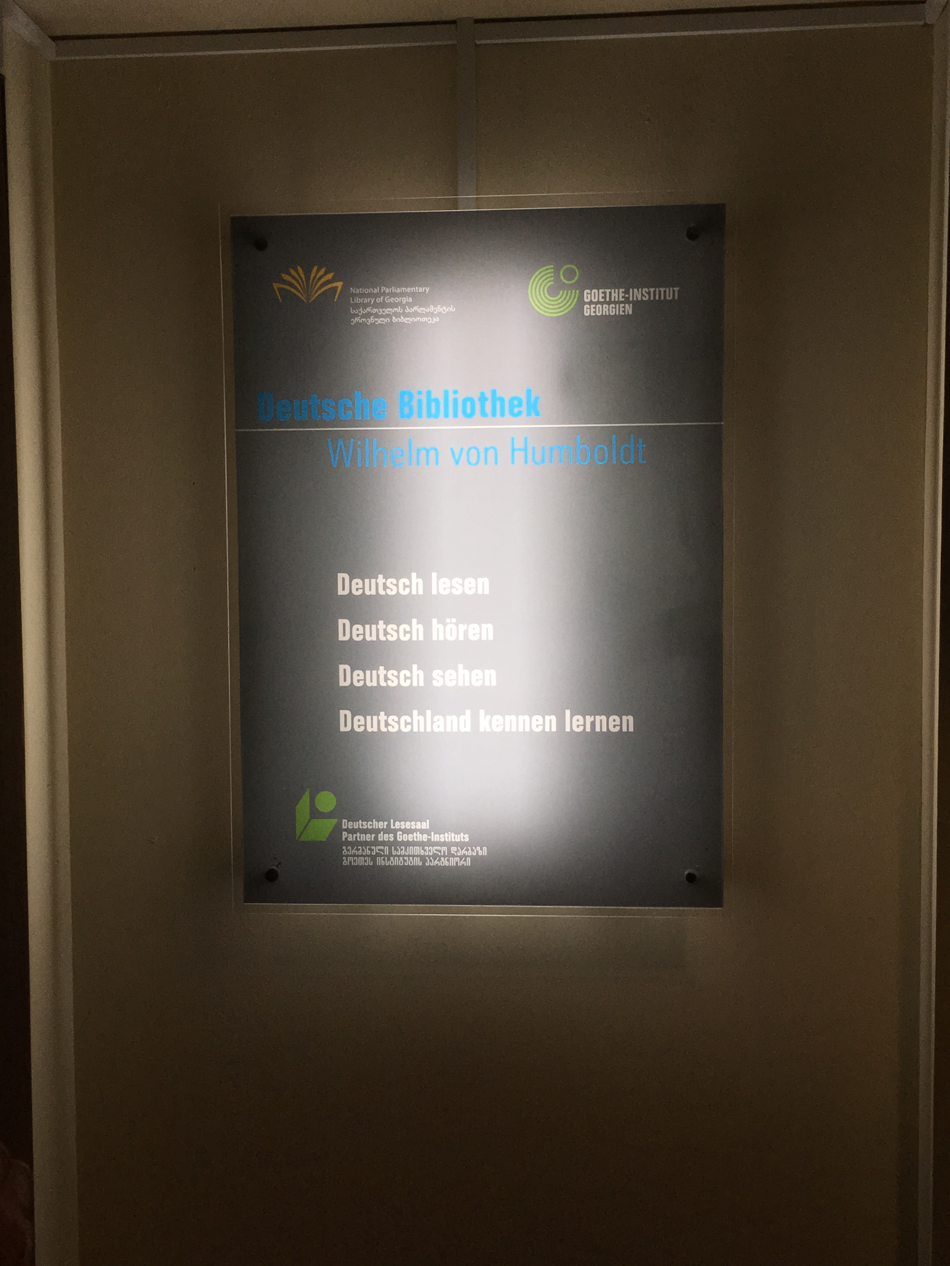 Nach dem Einführungsvortrag im Goethe-Institut (früheres Konsulat des Deutschen Reichs) sahen wir auch das alte Hauptgebäude der Nationalbibliothek (früheres Bankgebäude im österreichischen Ringstraßenstil) und konnten dort verschiedene internationale Lesesäle besichtigen. Das Magazin mit den vier Millionen Bänden georgischer Literatur ist wohl anderswo untergebracht, ich darf aber beglückt berichten, dass es in Tiflis offensichtlich mindestens ein gutes deutschsprachiges Metaphysik-Handbuch gibt. Es gibt übrigens viele politische Parallelen zu Estland (ich war 2012 mal zehn Tage in Tallinn), z.B. auch, dass man das Land als seit dem Ersten Weltkrieg unabhängig betrachtet und die Sowjetzeit als Besatzung ansieht. Wir werden am Sonnabend, wenn ich das Programm recht erinnere, die Feierlichkeiten zum 100. Unabhängigkeitstag erleben. Eine recht rigide Sprachpolitik erinnert an Québec: Ähnlich, wie dort keine englischsprachige Inschrift ohne eine deutlich größere französischsprachige stehen darf, müssen hier öffentliche Schilder und Logos immer auch in georgischen Buchstaben gehalten sein, weswegen H&M hier ein riesiges georgisches Logo hat; das uns bekannte findet sich deutlich kleiner darunter.
