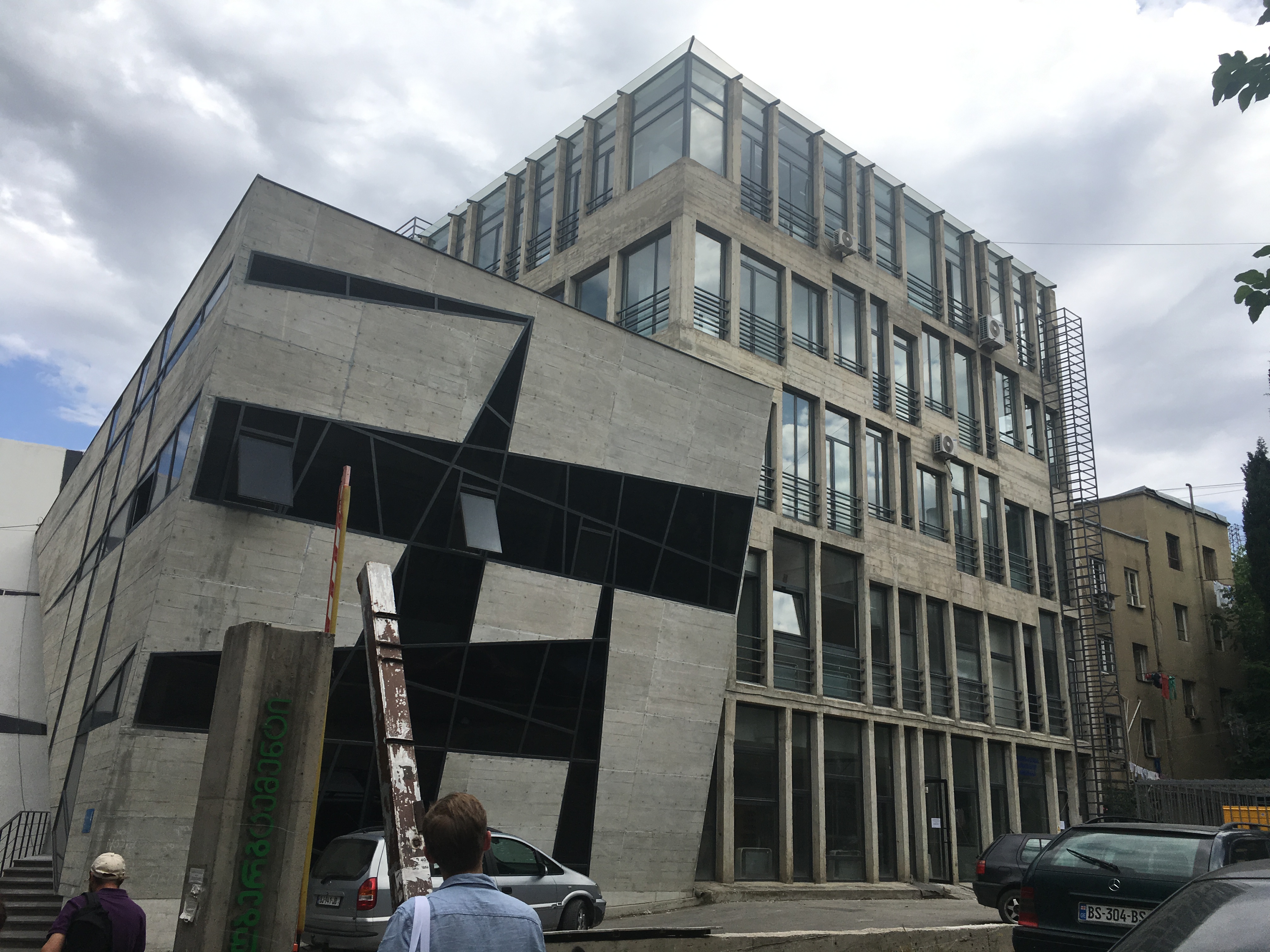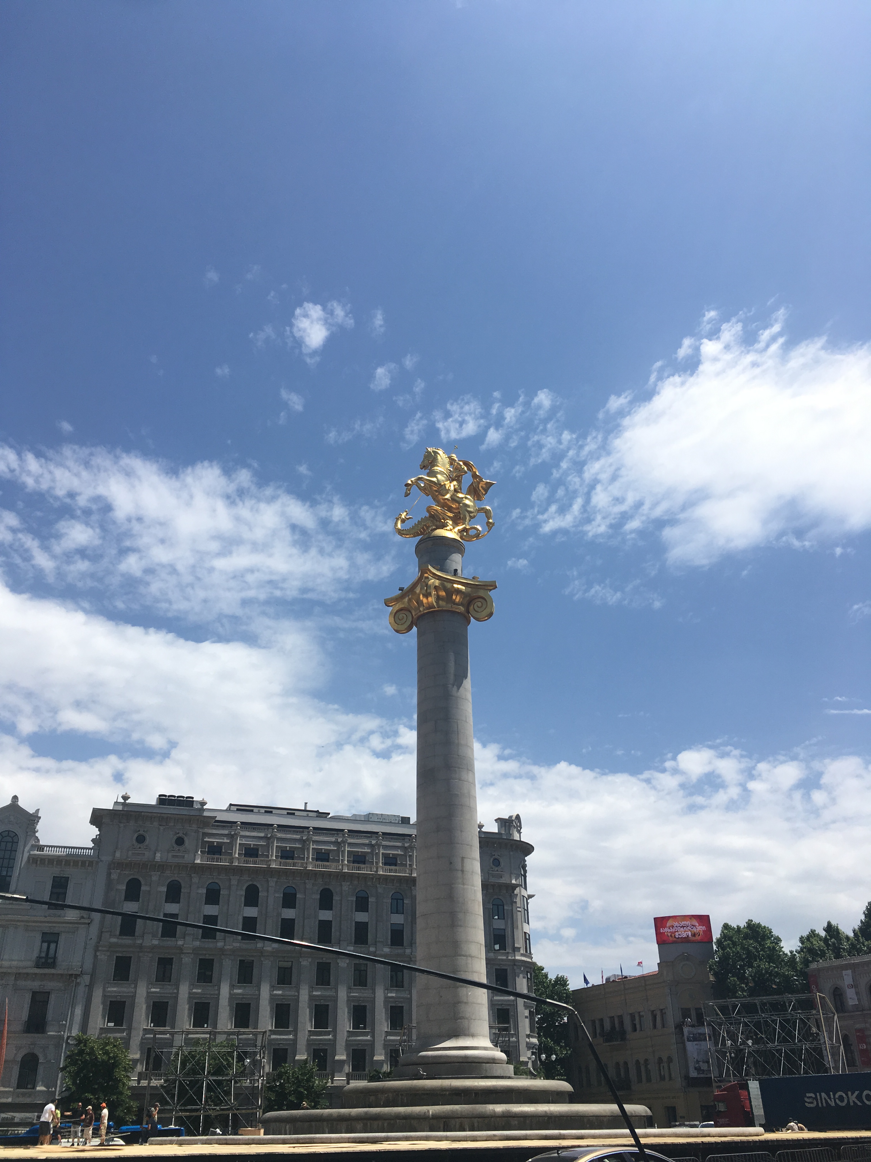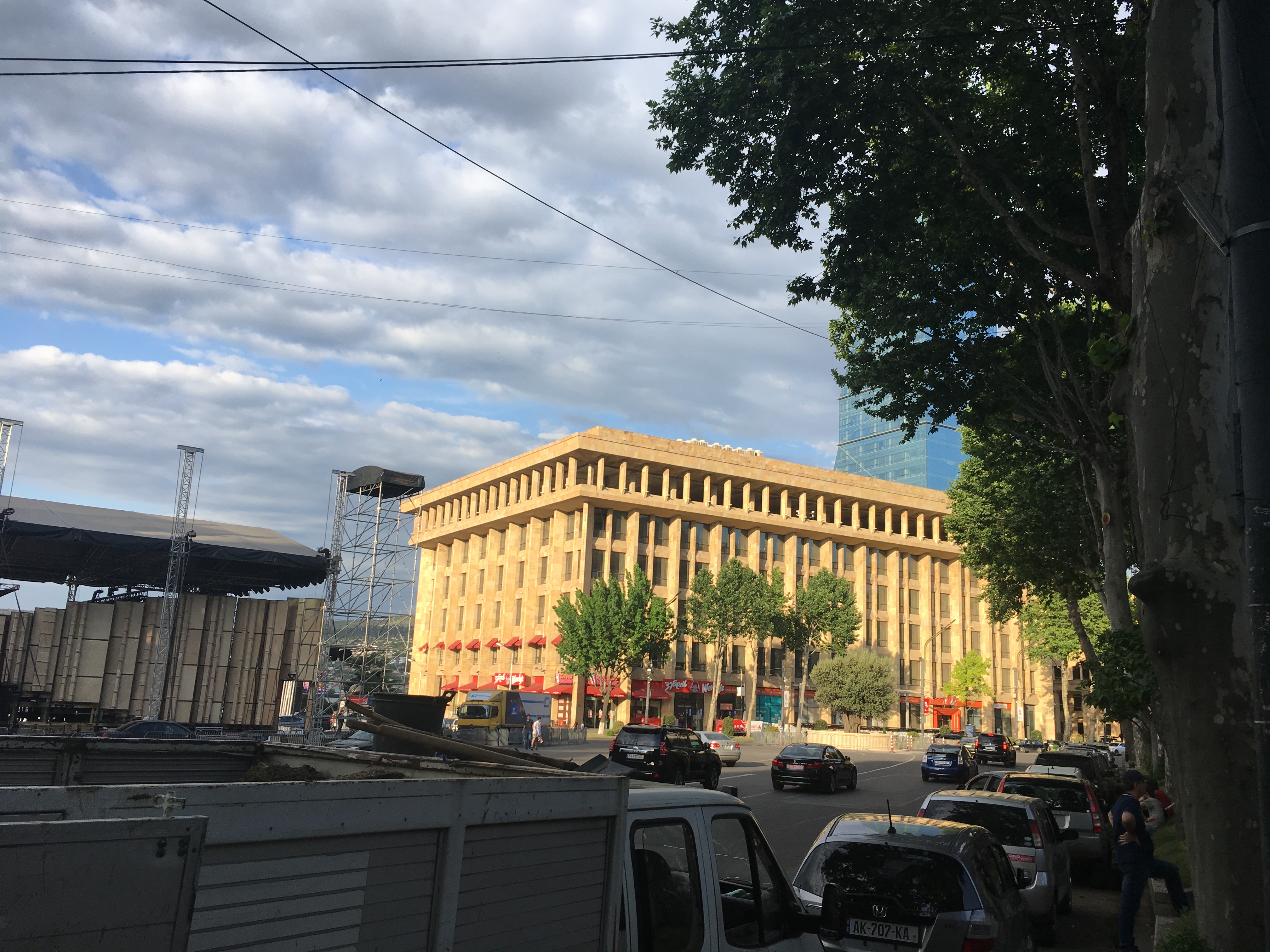 Nach dem Einführungsvortrag im Goethe-Institut (früheres Konsulat des Deutschen Reichs) sahen wir auch das alte Hauptgebäude der Nationalbibliothek (früheres Bankgebäude im österreichischen Ringstraßenstil) und konnten dort verschiedene internationale Lesesäle besichtigen. Das Magazin mit den vier Millionen Bänden georgischer Literatur ist wohl anderswo untergebracht, ich darf aber beglückt berichten, dass es in Tiflis offensichtlich mindestens ein gutes deutschsprachiges Metaphysik-Handbuch gibt. Es gibt übrigens viele politische Parallelen zu Estland (ich war 2012 mal zehn Tage in Tallinn), z.B. auch, dass man das Land als seit dem Ersten Weltkrieg unabhängig betrachtet und die Sowjetzeit als Besatzung ansieht. Wir werden am Sonnabend, wenn ich das Programm recht erinnere, die Feierlichkeiten zum 100. Unabhängigkeitstag erleben. Eine recht rigide Sprachpolitik erinnert an Québec: Ähnlich, wie dort keine englischsprachige Inschrift ohne eine deutlich größere französischsprachige stehen darf, müssen hier öffentliche Schilder und Logos immer auch in georgischen Buchstaben gehalten sein, weswegen H&M hier ein riesiges georgisches Logo hat; das uns bekannte findet sich deutlich kleiner darunter.