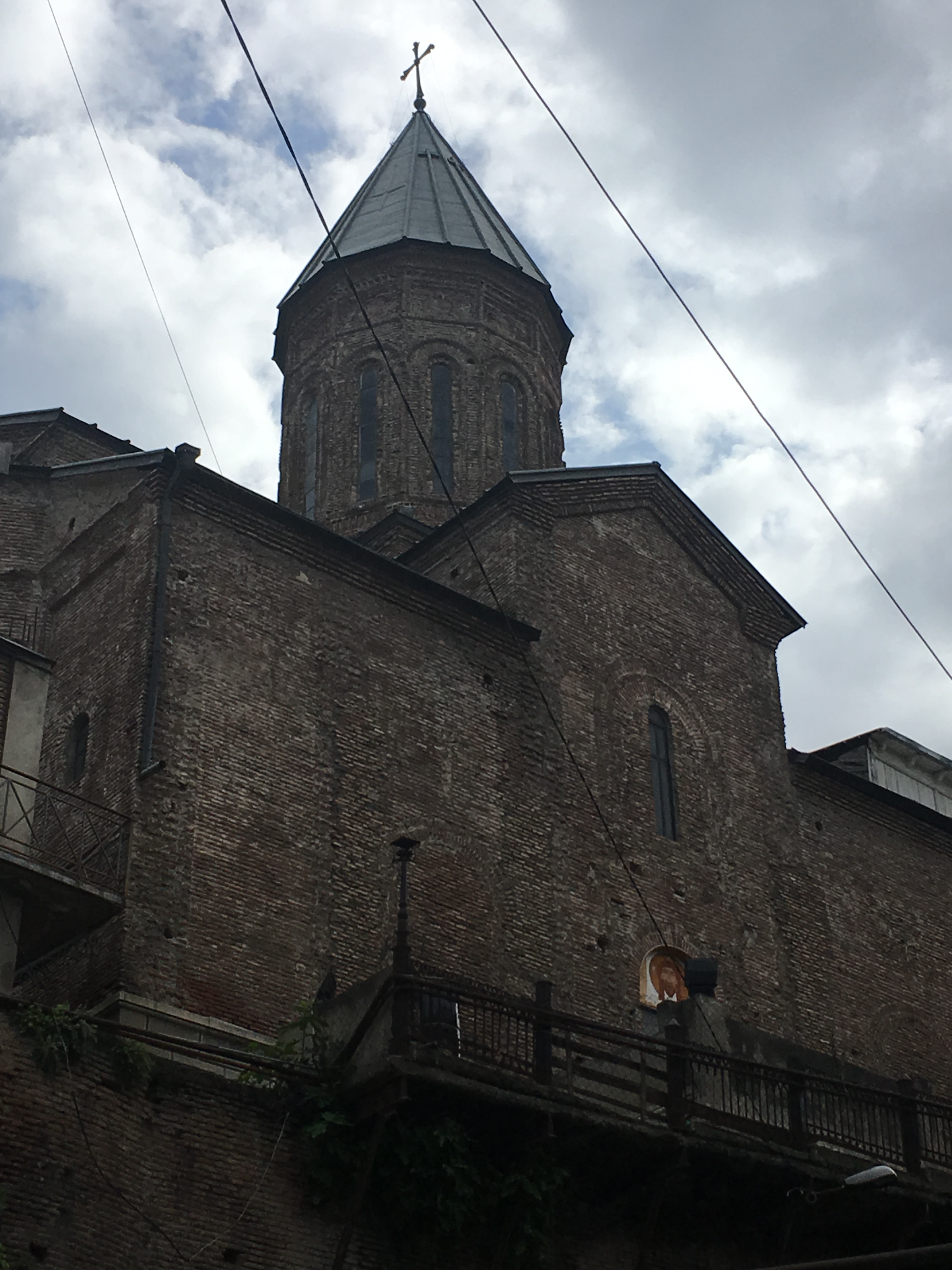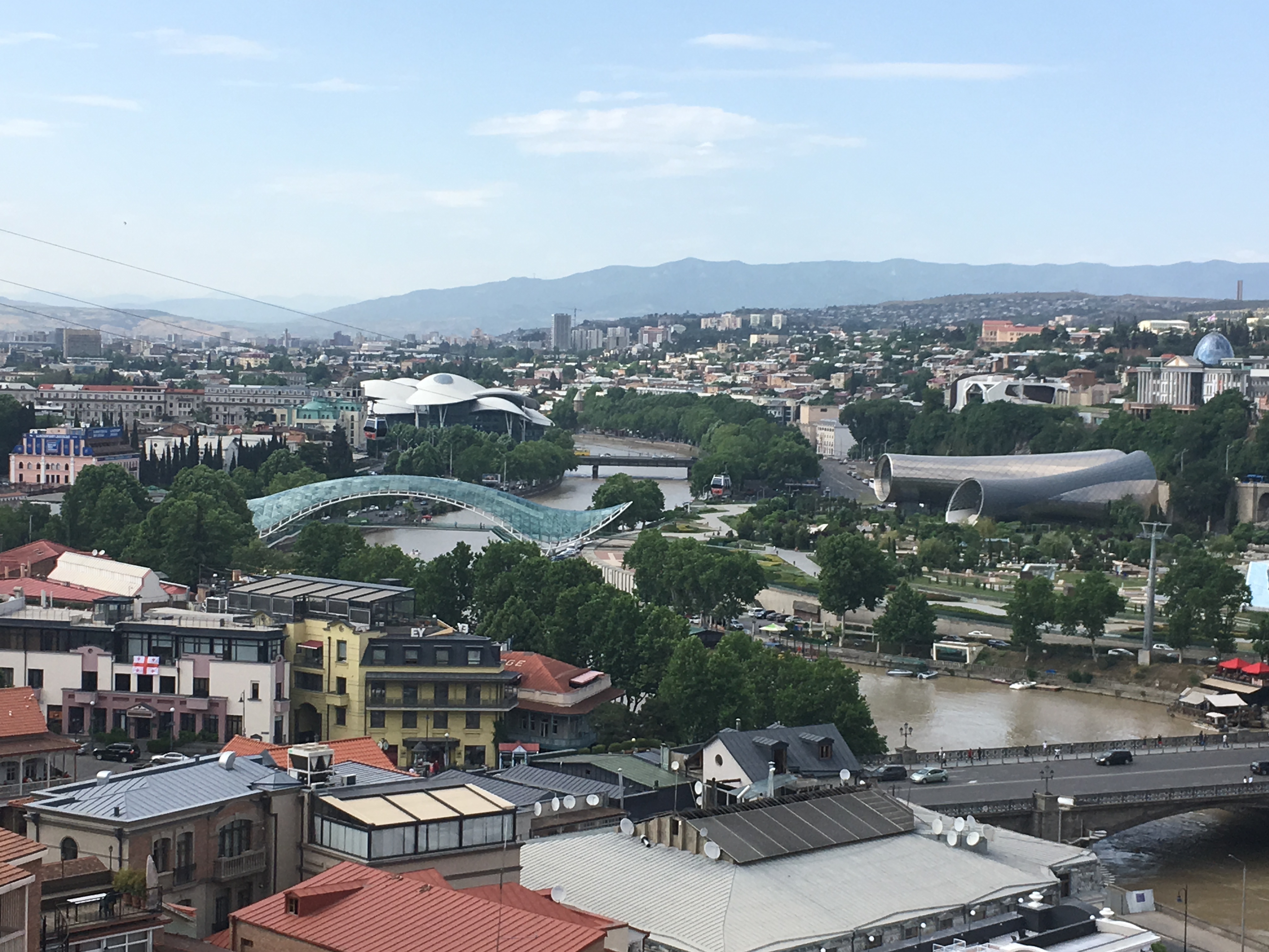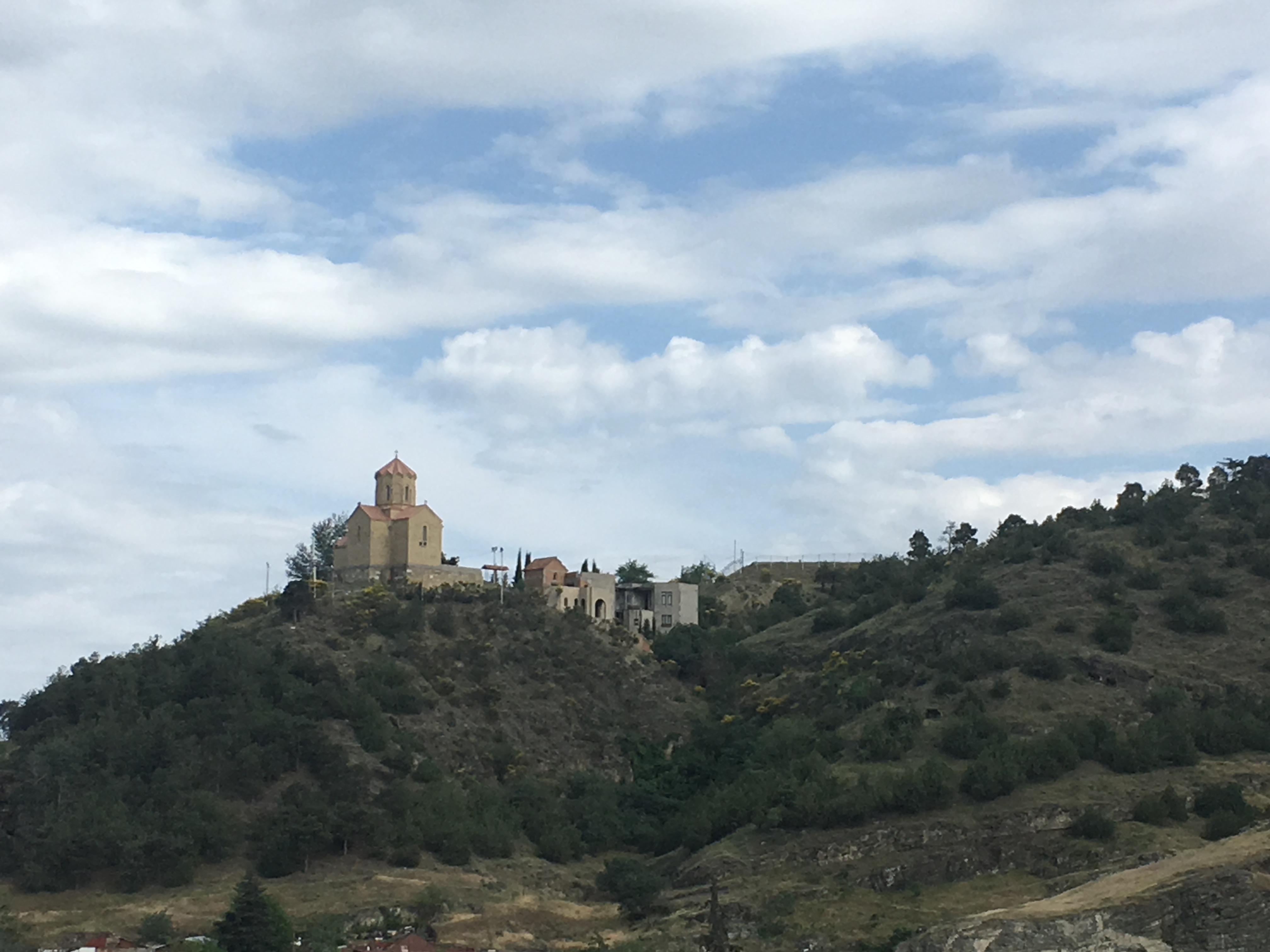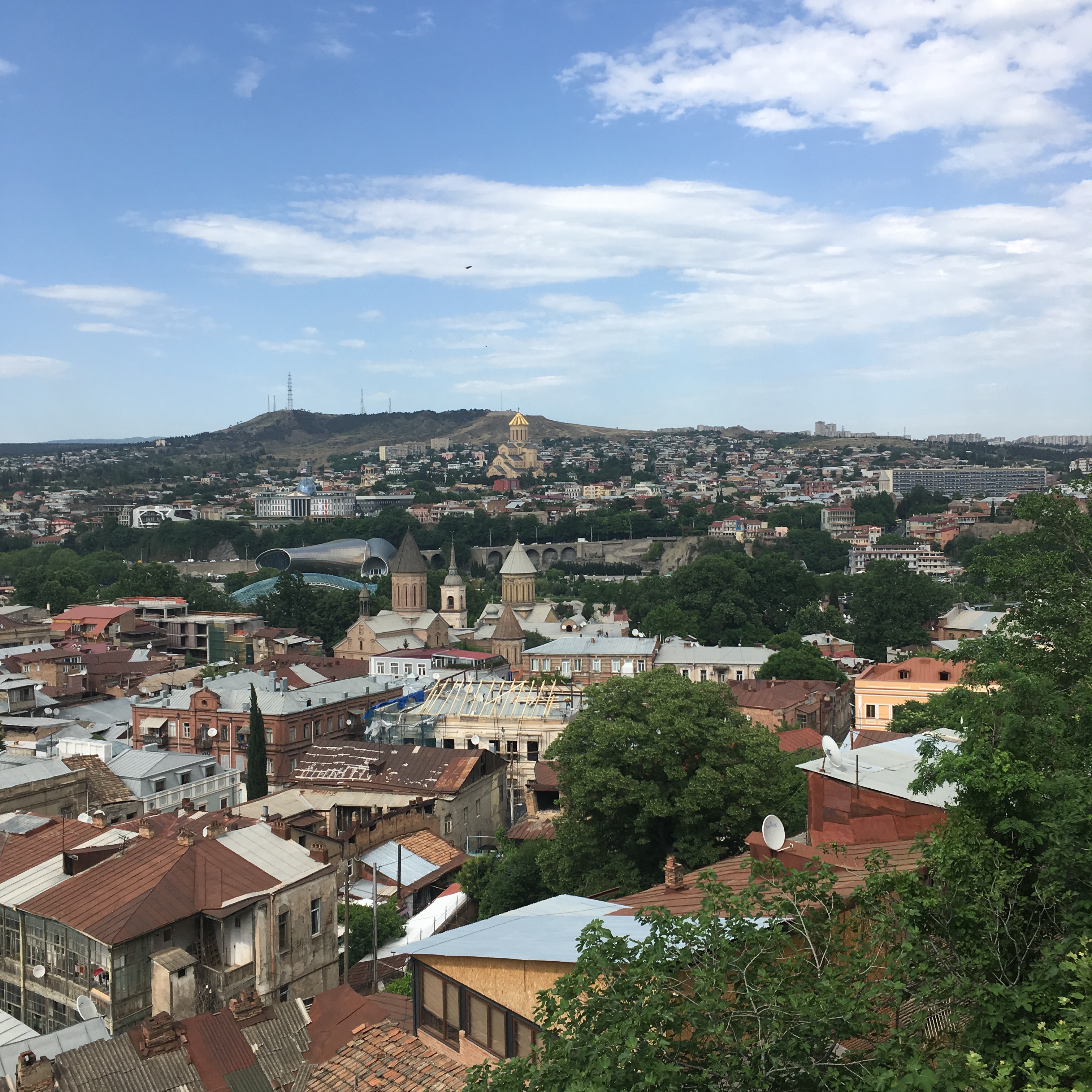 Tiflis ist eine ungeheuer sympathische Stadt, relativ ruhig und dezent beleuchtet, in einem Talkessel mit wahnsinnigen Aussichten, mit einem gewaltigen kulturellen Erbe, aber auch einer Ader für radikal moderne Architektur, die befremdlich anmutet, wenn man aus Deutschland anreist, und zu der ich sowohl online als auch unter den Mitreisenden sehr unterschiedliche Meinungen gehört habe. Es gibt eine Oberstadt mit Gassengewirr, vielen Treppenstraßen, historischen Kirchen und einer Festung drüber, sogar eine schief gepflasterte steile Straße, die linksrum hochführt – als alter Marburger fühlt man sich da sofort zuhause. Wir haben bei einer langen und kompetenten Stadtführung viel gesehen, und ca. 20 Katzensichtungen durfte ich auch verbuchen. Allen Vorurteilen zum Trotz findet man nicht an jeder Ecke ein schnelles freies WLAN, aber immer mal wieder gibt es eins – mehr, als man von vielen deutschen Städten sagen kann (das Jenaer Stadt-WLAN z.B. kriege ich auf einem iPhone einfach nicht ans Laufen, sorry, aber ich sage nur wie es ist, liebe Jenaer Stadt-IT).