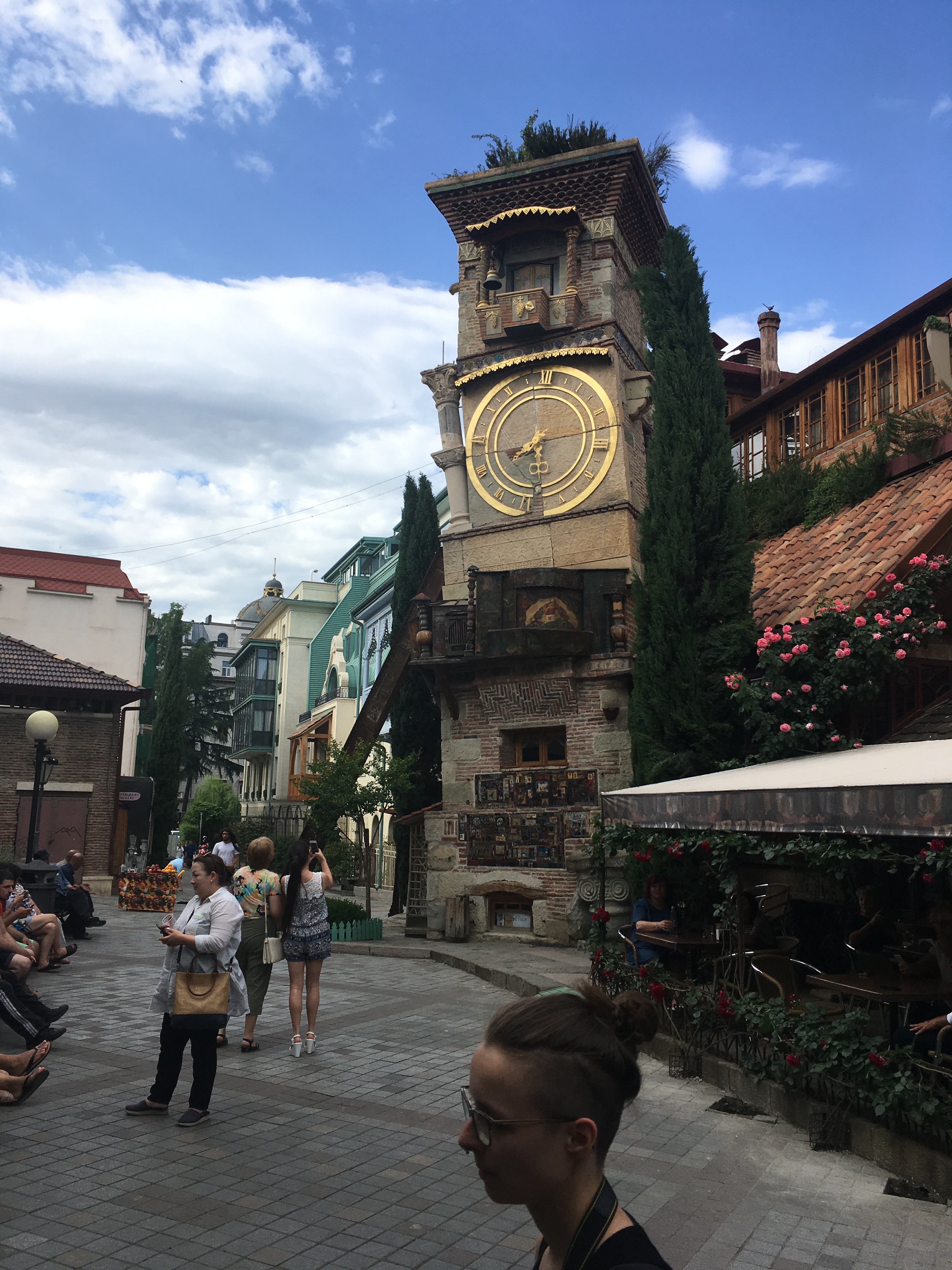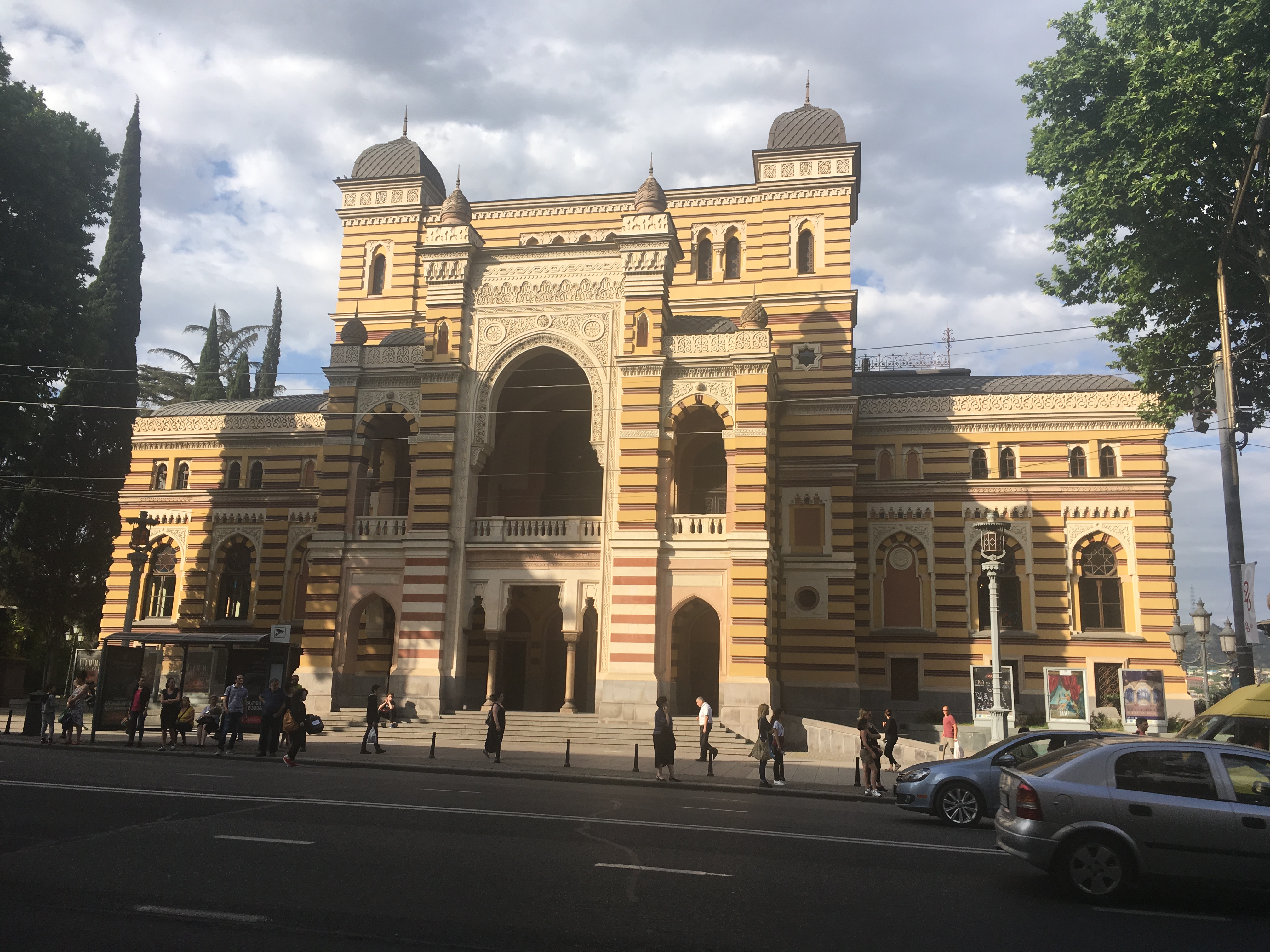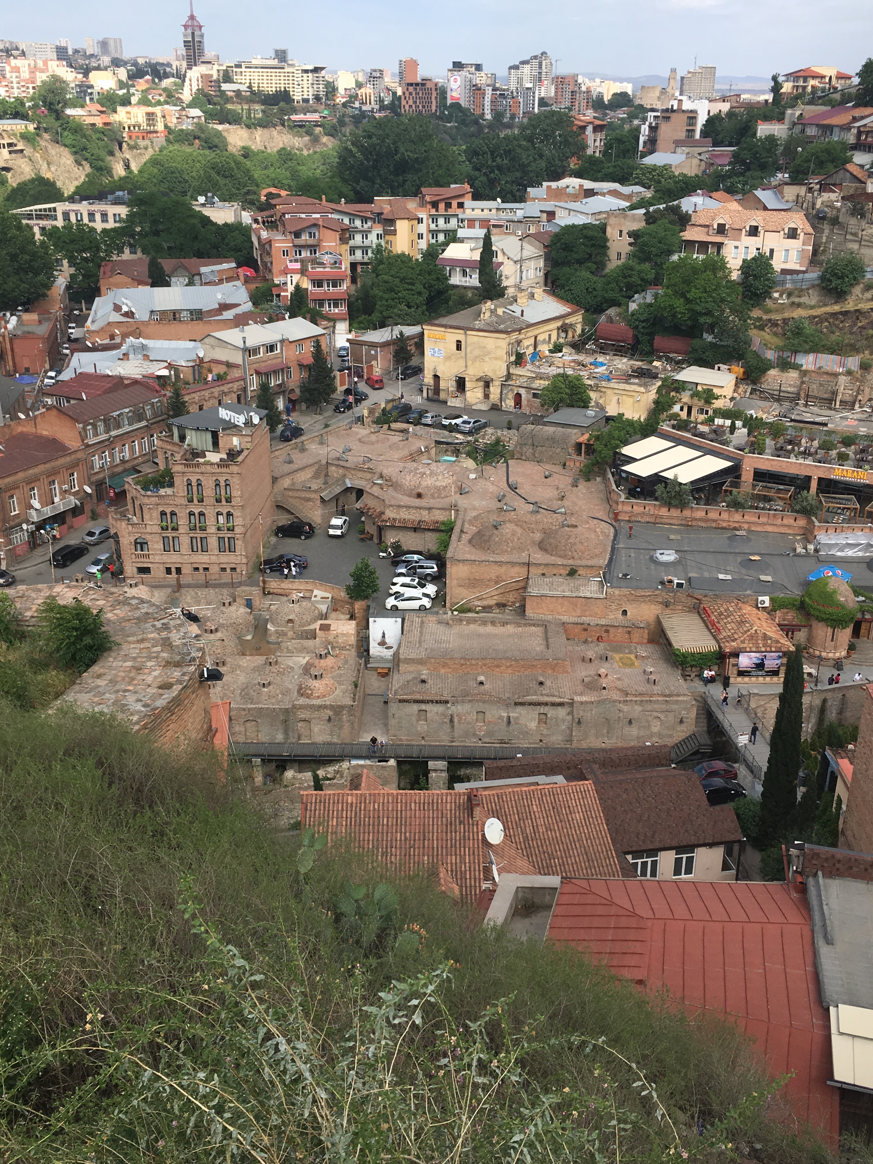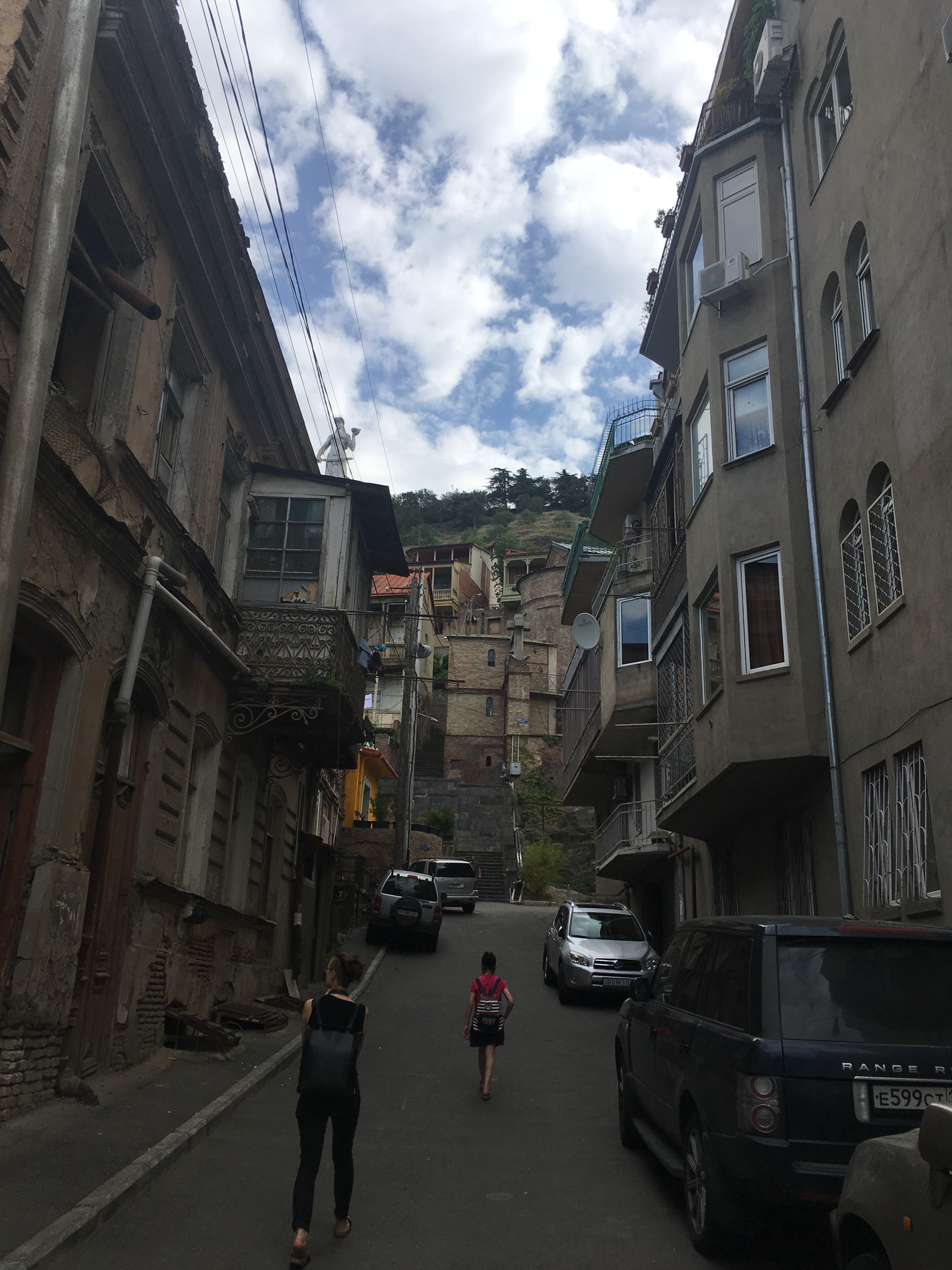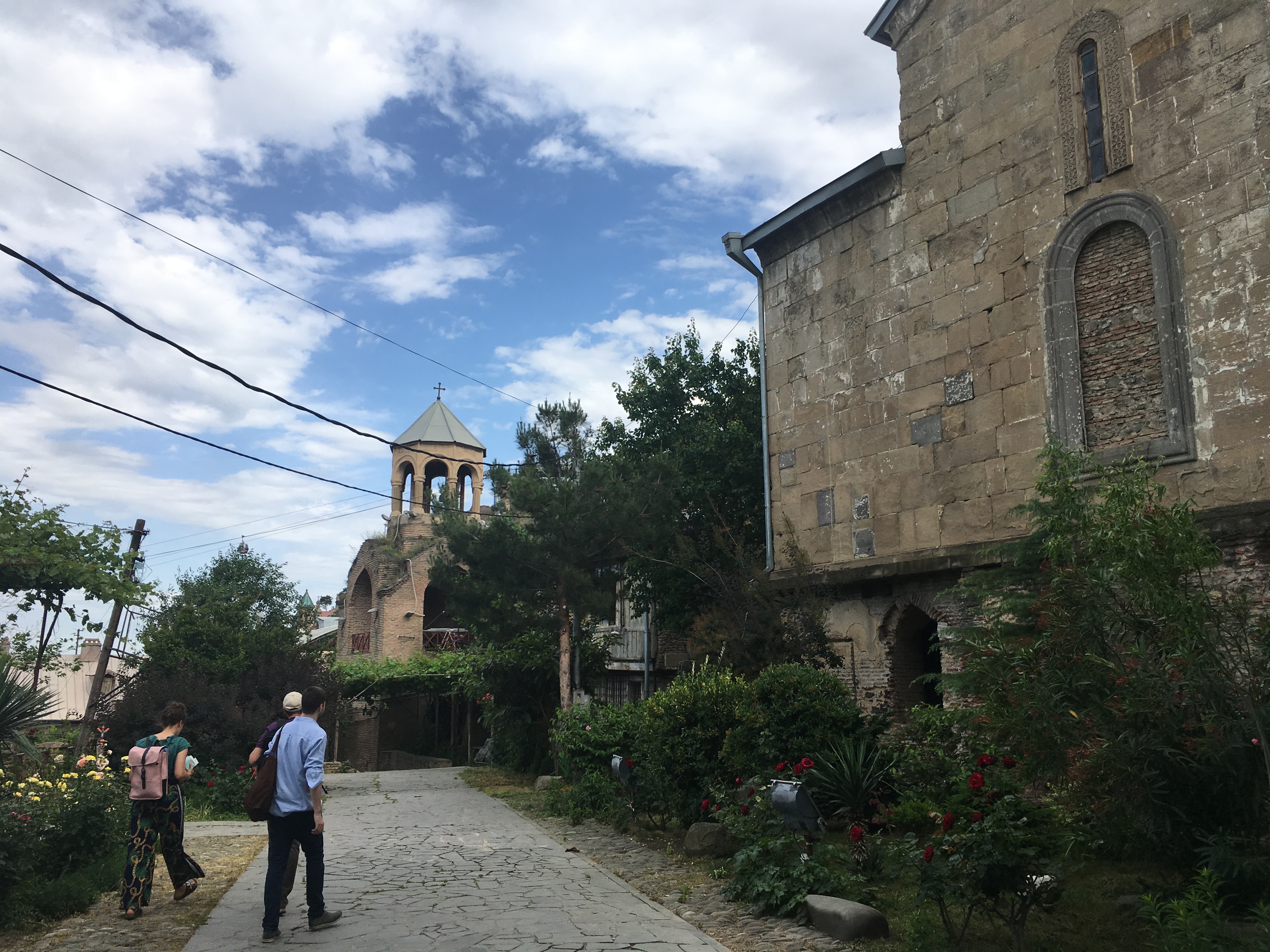 Tiflis ist eine ungeheuer sympathische Stadt, relativ ruhig und dezent beleuchtet, in einem Talkessel mit wahnsinnigen Aussichten, mit einem gewaltigen kulturellen Erbe, aber auch einer Ader für radikal moderne Architektur, die befremdlich anmutet, wenn man aus Deutschland anreist, und zu der ich sowohl online als auch unter den Mitreisenden sehr unterschiedliche Meinungen gehört habe. Es gibt eine Oberstadt mit Gassengewirr, vielen Treppenstraßen, historischen Kirchen und einer Festung drüber, sogar eine schief gepflasterte steile Straße, die linksrum hochführt – als alter Marburger fühlt man sich da sofort zuhause. Wir haben bei einer langen und kompetenten Stadtführung viel gesehen, und ca. 20 Katzensichtungen durfte ich auch verbuchen. Allen Vorurteilen zum Trotz findet man nicht an jeder Ecke ein schnelles freies WLAN, aber immer mal wieder gibt es eins – mehr, als man von vielen deutschen Städten sagen kann (das Jenaer Stadt-WLAN z.B. kriege ich auf einem iPhone einfach nicht ans Laufen, sorry, aber ich sage nur wie es ist, liebe Jenaer Stadt-IT).