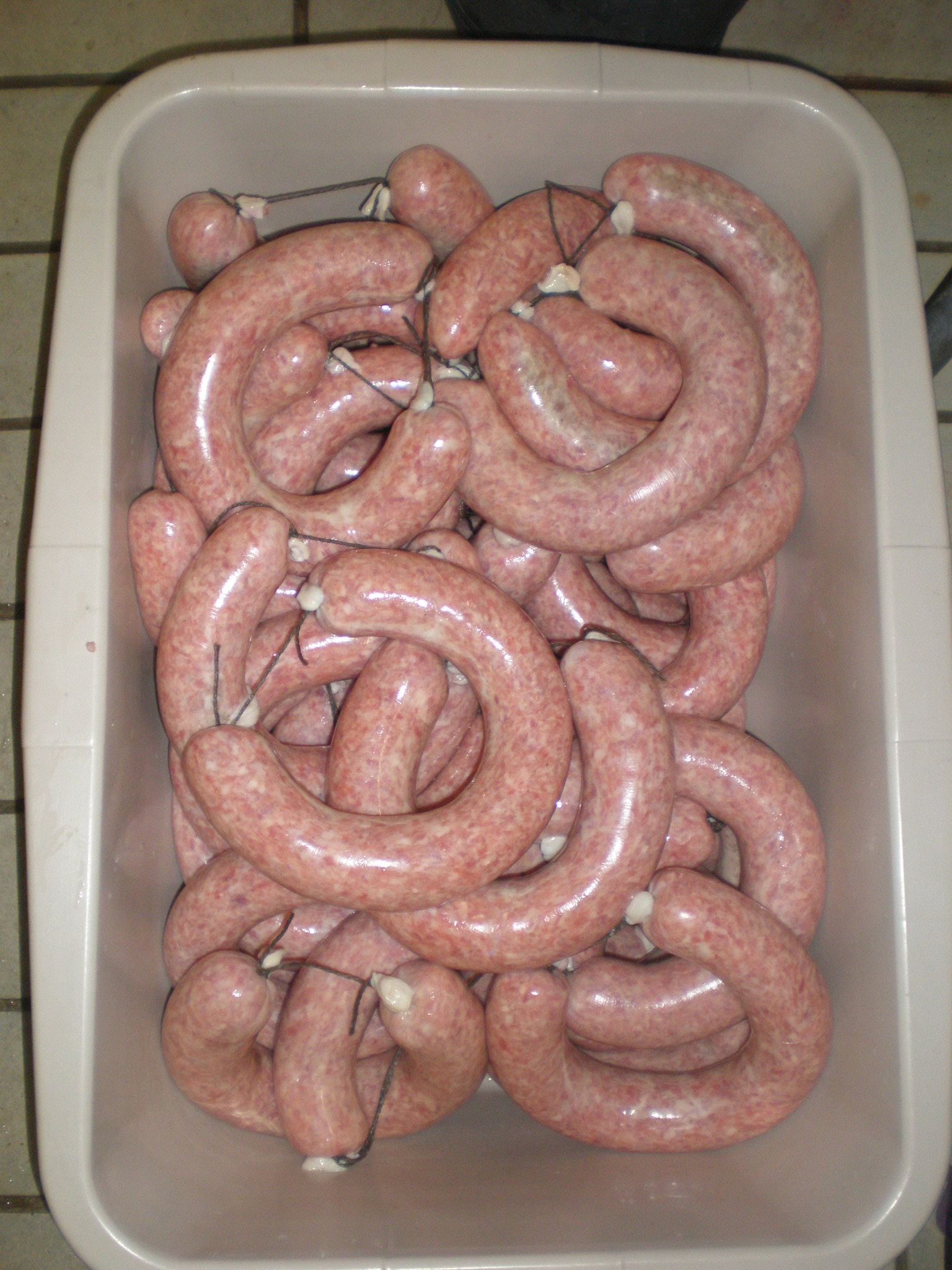 Pit wässert und schrubbt die Ladefläche des Hängers, wir heben gemeinsam den Bottich mit den Innereien hinauf, die er auf seinem Hof auf den Mist schmeißen wird. Fast alle Würste laden wir in sein Auto, sie sollen geräuchert werden. Von Blut- und Leberwurst gibt er uns jeweils ein paar frische mit. Ohne große Sentimentalitäten gehen wir auseinander, die Rechnung für das Schwein und seine Arbeit schickt er uns mit der Post. Außerdem gibt er Bescheid, wenn wir die geräucherte Wurst abholen können. „Denkt dran“, verabschiedet uns Pit, „nur schlechte Wurst braucht Senf.“