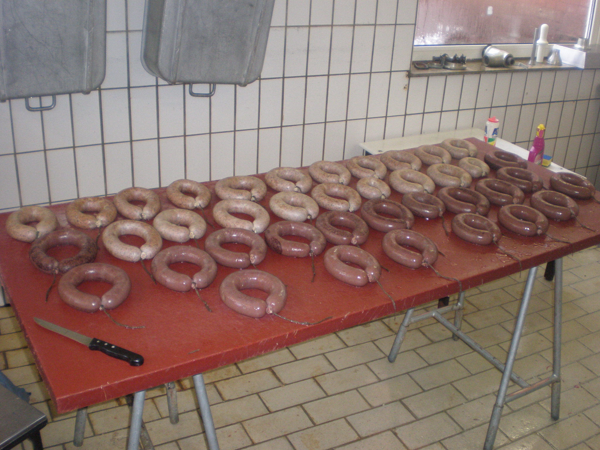 Auf der Oberfläche hat sich irgendeine Eiweißschlacke abgesetzt. „Müsster abschöpfen“, sagt Pit, doch weder Simone noch ich haben große Lust darauf mit bloßen Händen in fünf Litern Blut zu fischen. Der Metzger übernimmt wenig zimperlich und gießt einen großen Schwall in die Wanne mit Blutwurstteig. Simone greift in den Eimer, feuchtet ihren Finger im Blut an und wischt mir unter der Nase lang. „Mengen“, weist Pit an, doch wir möchten nur ungern. Pit mengt vor, durch die Flüssigkeit ist der Wurstteig nun viel breiiger. Zwischendurch probiert Peter. Es schüttelt uns. Rohes Gehacktes zu essen, das noch warm ist, aber sonst wie gewohnt, mag angehen, mit Leberbrei Versetztes war schon eklig, aber einen Brei aus warmen Fleisch und Blut zum Munde zu führen, von den Fingern zu lecken, ist sehr abstoßen. Unsere Blicke sagen ihm das. „Ja, und wenn die Wurst nicht schmeckt? Wenn nicht genug Salz dran ist? Muss man halt probieren“, die Erklärung leuchtet ein, nur tauschen wollen wir mit Pit nicht. Wieder werden Gläser und Därme gefüllt, Därme in den Kessel gelegt. Draußen wird es langsam dunkel. Unter Pits Anleitung räumen wir auf und putzen, nutzen sehr viel Putzsand und sehr heißes Wasser. Zuletzt fischen wir die Würste aus dem Kessel und lassen die Brühe in den Ausguss plätschern. „Stop! Da honner gute Worschtsubb“, Pit holt einen Topf und füllt fünf Liter ab.
