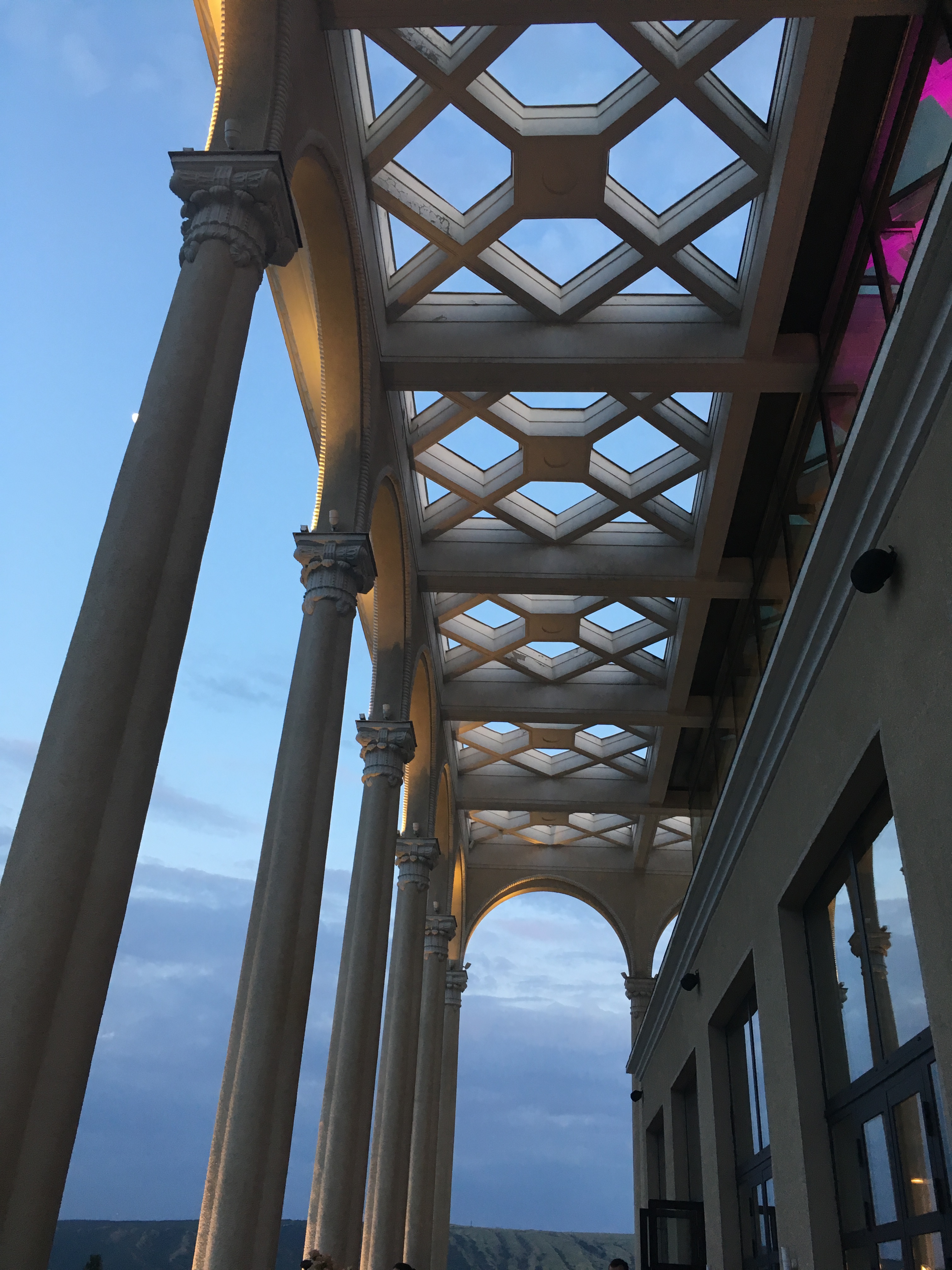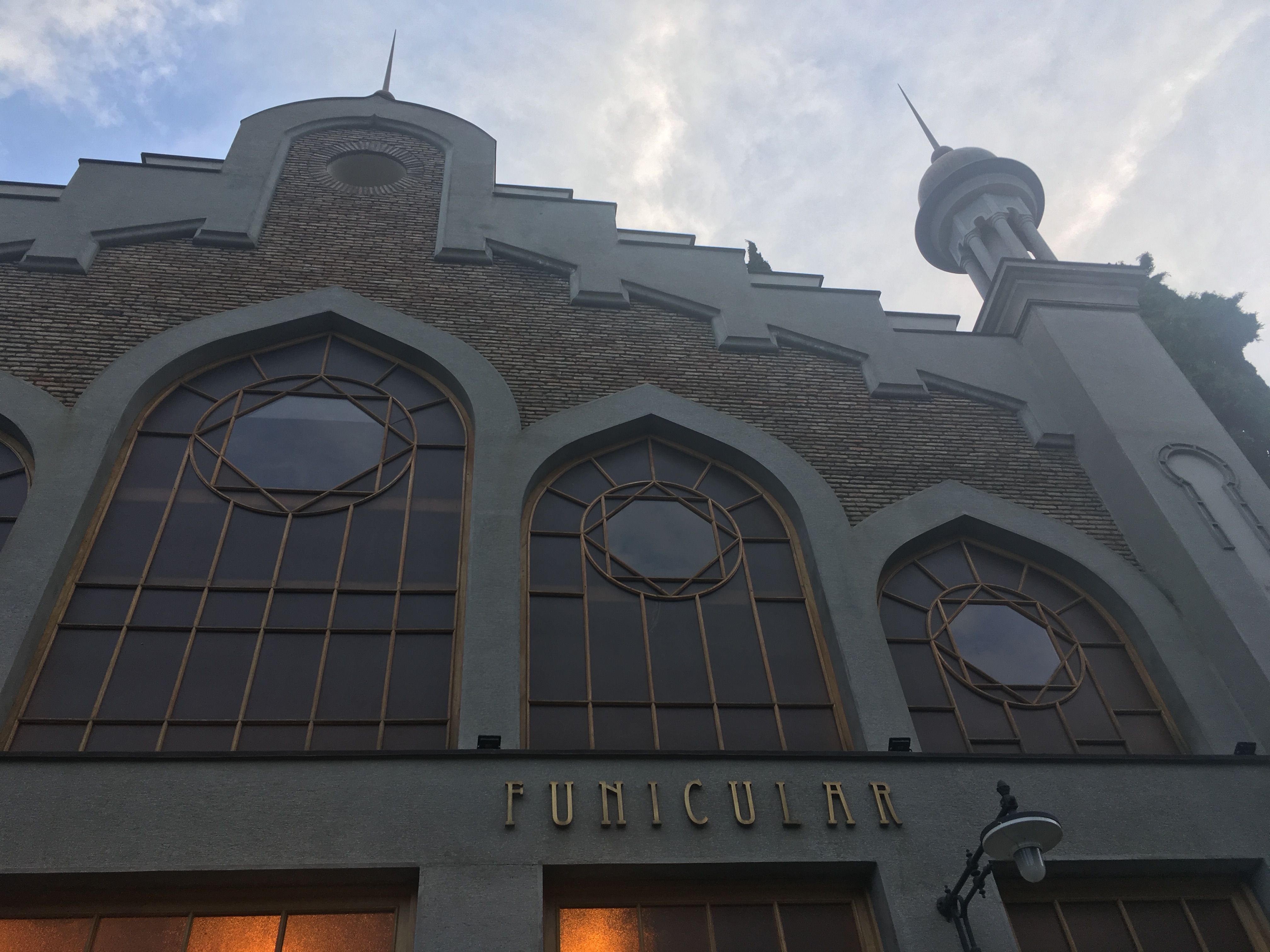 Am Abend dann wieder Essen mit Autoren, diesmal hoch über der Stadt in dem pompösen Aussichtspavillon, der den Endbahnhof der Standseilbahn bildet, mit angemessen spektakulärer Aussicht. Es gab klischeehafte Trinksprüche über das (vorsichtig gesagt spezielle) georgisch-deutsche Verhältnis zwischen 1918 und 1945, und sehr guten georgischen Wein – ob das nun der vergessene war oder nicht, weiß ich nicht. Unzählige Sicherheitsleute zeugten davon, dass anscheinend jemand Reiches oder jemand von der Regierung (oder beides) im Nebentrakt feierte. Anschließend hätte man noch ein Elektrofestival besuchen können, was sich jedoch die meisten angesichts allgemeiner Zerstörtheit gespart haben. Vom Seilbahnhof aus konnte man deutlich erkennen, welche Spuren die Immobilienkonjunktur hinterlassen hat. Für mein naives Auge scheint es in Tiflis vier Kategorien auffällig moderner Gebäude zu geben: